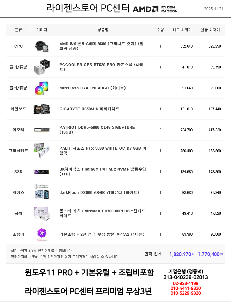 국민컴퓨터 권장사양 라이젠5 9600, RTX5060, 32G 게임용 컴퓨터 아이온2, 배틀그라운드, GTA6 추천조립PC 10% 특가 라이젠스토어 PC센터 성북구 동대문구 종로구 실기간채팅 조립PC 견적상담