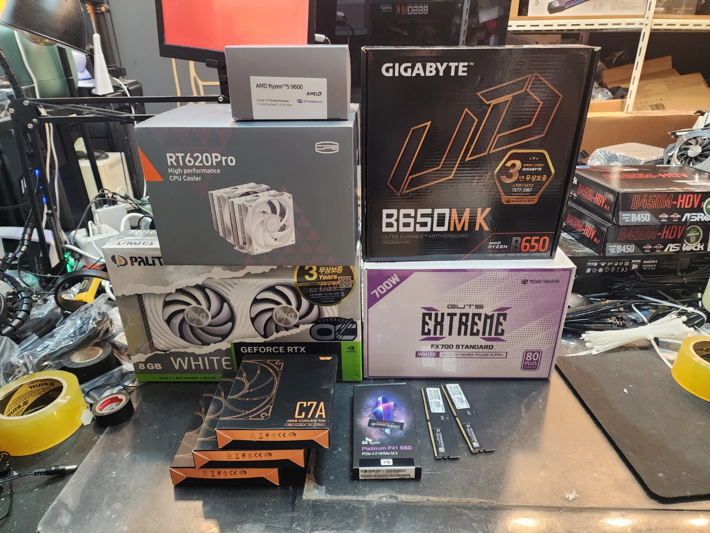 CPU - AMD 라이젠5-6세대 9600 (그래니트 릿지) (멀티팩 정품) 쿨러/튜닝 - PCCOOLER CPS RT620 PRO 카본스틸 (화이트) 쿨러/튜닝 - darkFlash C7A 120 ARGB (화이트) 메인보드 - GIGABYTE B650M K 피씨디렉트 메모리 - PATRIOT DDR5-5600 CL46 SIGNATURE (16GB) 그래픽카드 - PALIT 지포스 RTX 5060 WHITE OC D7 8GB 이엠텍 SSD - SK하이닉스 Platinum P41 M.2 NVMe 병행수입 (1TB) 케이스 - darkFlash DS900 ARGB 강화유리 (화이트) 파워 - 몬스타 가츠 ExtremeX FX700 80PLUS스탠다드 화이트 국민컴퓨터 권장사양 라이젠5 9600, RTX5060, 32G 게임용 컴퓨터 아이온2, 배틀그라운드, GTA6 추천조립PC 10% 특가 라이젠스토어 PC센터 성북구 동대문구 종로구